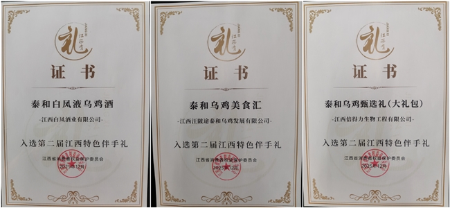 近日,从省消费者权益保护委员会传来喜讯,在第二届“江西特色伴手礼”评测公益活动评选中,泰和县选送的“泰和白凤液乌鸡酒”“泰和乌鸡美食汇”“泰和乌鸡甄选礼”三款产品成功入选最终名录,荣获“江西特色伴手礼”称号。