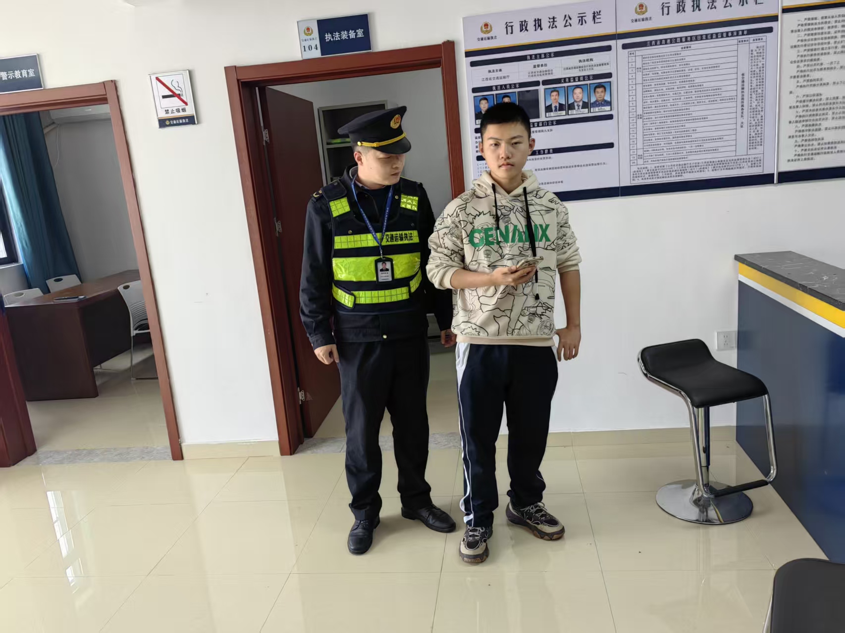 温情守护暖人心。在严格规范公正文明执法的同时,各大队积极开展暖心服务,在服务区执法室设置“执法+服务”站点,让司乘群众更安心、更暖心、更舒心。春运返程期间,一名儿童在大广高速万安服务区不慎与家人走失,焦急地来到九支队三大队执法室求助。执法人员见状立即上前安抚孩子情绪,耐心询问情况。通过孩子提供的信息,执法人员迅速电话联系上其焦急万分的父母,告知孩子安全情况。当孩子父母赶到执法室,见到孩子平安无事时,对执法人员连声道谢。