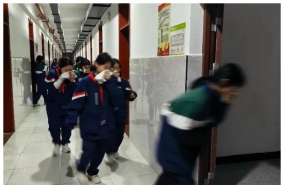 班主任专题会上,保卫科主任刘禧梁用直观的示意图向老师们展示应急避难场所位置。为确保演练成功,所有学生能够安全有序地撤离,老师们早早在布置的点位就绪。19时10分许,警报声划破校园夜空,全体同学迅速反应、沉着应对。大家第一时间取来湿毛巾,紧紧捂住口鼻,弯腰低姿、沉着有序,沿着预定消防通道快速撤离。夜色之中,脚步坚定而不乱,动作规范而不慌,用冷静与默契展现出良好的安全素养与应急能力,整个过程紧张有序、高效顺畅。